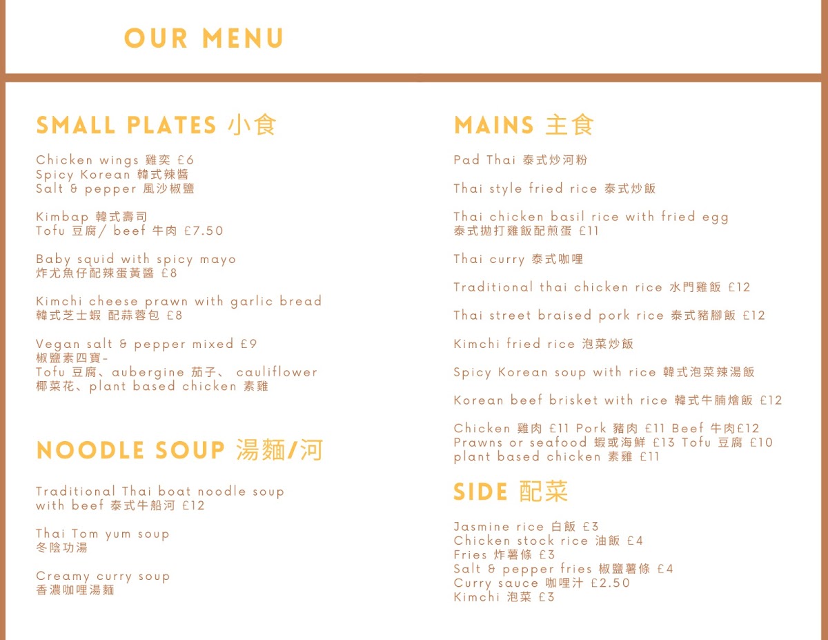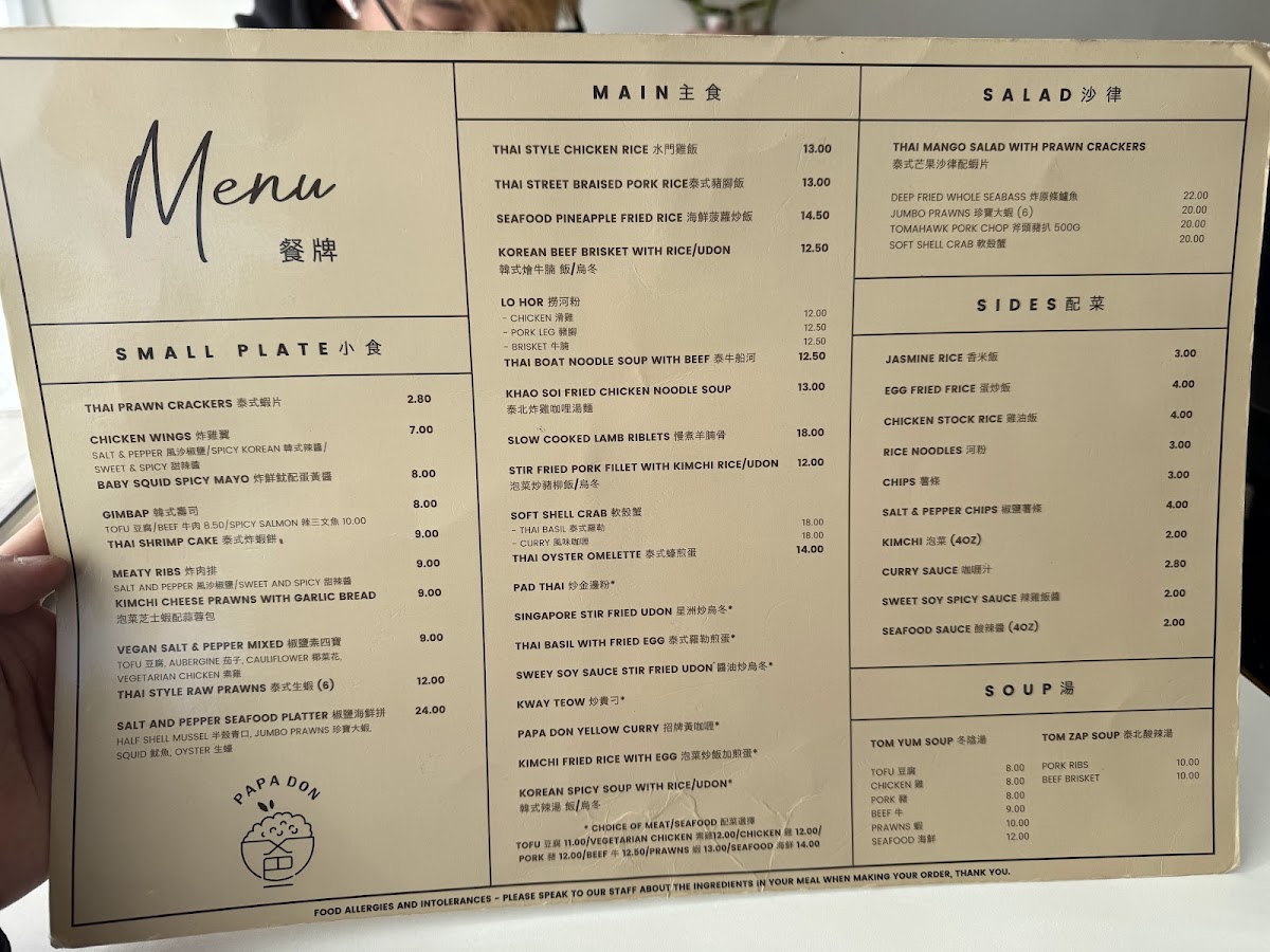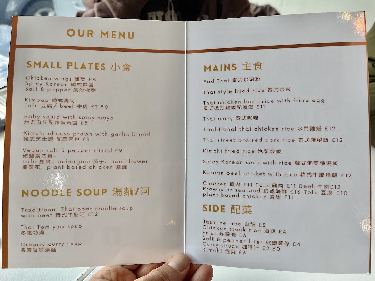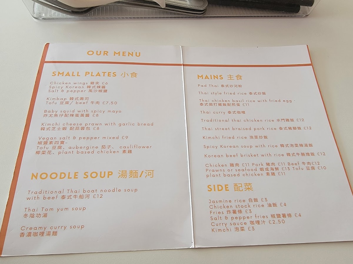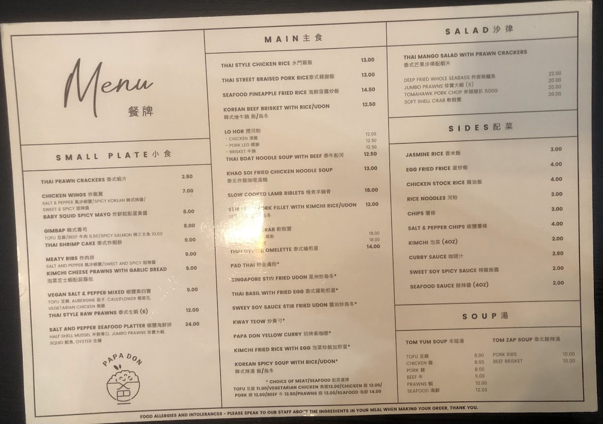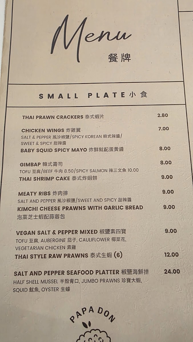 PaPa Don offers an enticing menu that highlights authentic northern Thai dishes and vibrant Korean flavors. Start with their Thai Mango Salad with Prawn Crackers (£20.00), a refreshing choice, or indulge in small plates like the Salt & Pepper Chicken Wings (£7.00) and Sweet & Spicy Meaty Ribs (£9.00). For a unique twist, try the Kimchi Cheese Prawns (£9.00).